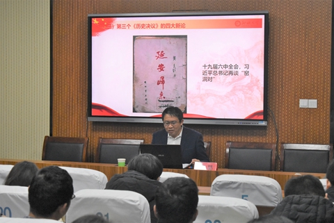 为深入学习宣传贯彻党的十九届六中全会精神,2022年1月6日,邀请9428cn太阳集团古天乐党史学习教育宣讲团成员、马克思主义公司副教授黄昊做了题为《中国共产党三个历史决议的历史使命及重要意义》的专题宣讲,公司全体教师参加此次宣讲会。