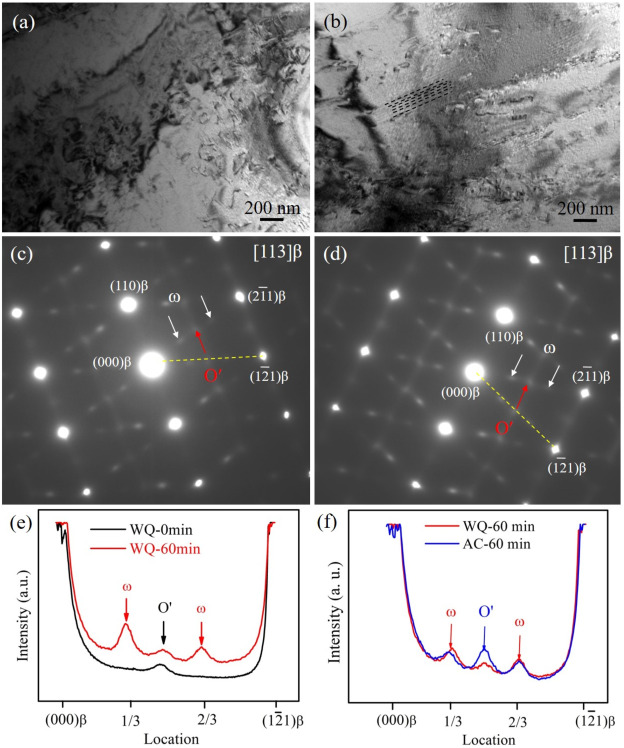 Ti-5321合金固溶后在200℃时效1h后的微观组织与相组成如图1所示,时效过程中ω和O′相持续析出,含量不断上升,与水淬态Ti-5321合金相比,空冷态合金在时效后的组织中O′相含量明显更高。两种亚稳相含量的上升使得合金的屈服强度不断上升,产生了显著析出强化效果,如图2所示。由于空冷态合金在时效后仍然具有更高含量的O′相,其强度可进一步提高。有趣的是由于O′相的形成,ω相本身自带的脆性效果消失,合金在保温时间不超过1h时,塑性没有下降,反而表现出不断上升的趋势,直至保温时间超过1h后ω相致脆效果才逐渐显现。亚稳相含量的上升抑制了变形过程中发生应力诱导相变行为,使得合金的主导变形机制逐渐由应力诱发相变转变为机械孪晶与位错滑移。