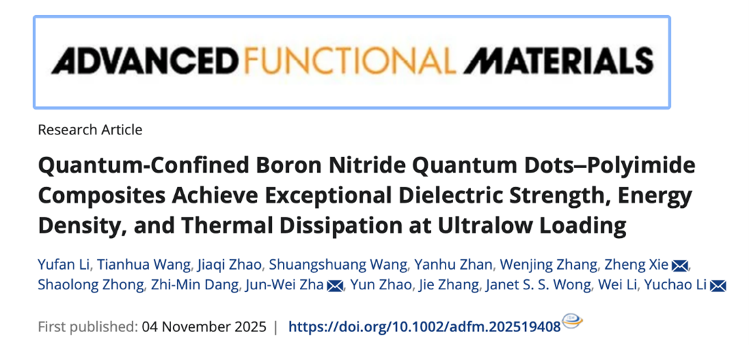 近日,9428cn太阳集团古天乐李玉超教授团队联合济南大学谢政教授、华北电力大学查俊伟教授,在兼顾耐高温导热储能电介质材料方面取得新的进展。相关成果以“Quantum-confined boron nitride quantum dots-polyimide composites achieve exceptional dielectric strength, energy density, and thermal dissipation at ultralow loading”为题,发表在国际顶级期刊《Advanced Functional Materials》(一区TOP期刊,IF="19.0)上。论文第一作者为硕士研究生李雨凡同学,通讯作者为李玉超教授,9428cn太阳集团古天乐为第一署名单位。