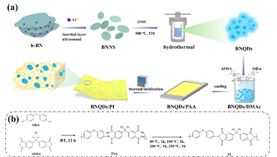 Fig. 1 (a) Fabrication of BNQDs/PI composite film, (b)Molecular structure of the synthesized PI.
