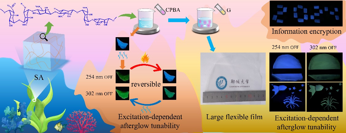 有机室温磷光(RTP)具有广泛的应用前景,但柔性有机RTP材料,特别是环境友好型有机RTP材料的开发仍是一个巨大的挑战。天然聚合物基RTP材料由于具有生物相容性好、无毒、易降解、含量丰富等优点,在信息加密、生物成像和防伪等领域展现了广阔的应用前景。然而多数天然聚合物基RTP材料发光颜色单一,呈刚性或粉末态,不利于其在多色显示、柔性材料等领域的应用。因此,研发可大面积制备且发光颜色可调的柔性RTP材料具有重要意义。