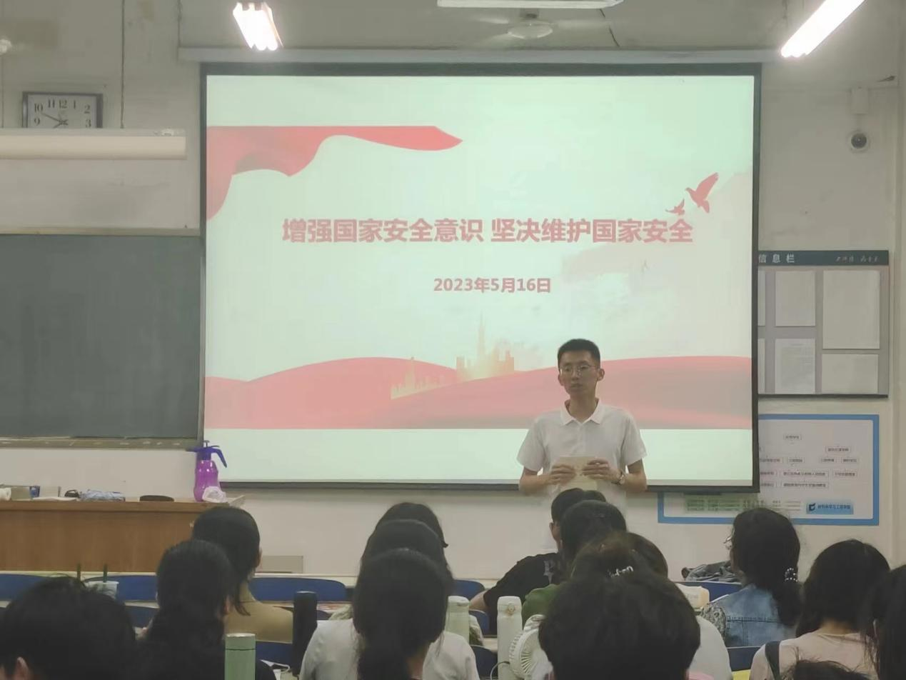 齐老师以国家安全日的由来为切入点,从国家安全观的核心要义、基本内涵、全民国家安全教育日的意义、破坏国家安全的行为、贯彻总体国家安全观的具体要求等方面进行了深刻阐释和详细解读。他强调今后要通过主题班会、党团活动等方式将国家安全宣传融入日常教育活动中,不断增强广大青年学子树立“国家之安全、青年之责任”的意识,进一步教育引导全体同学坚持总体国家安全观,树牢底线思维,发扬斗争精神。