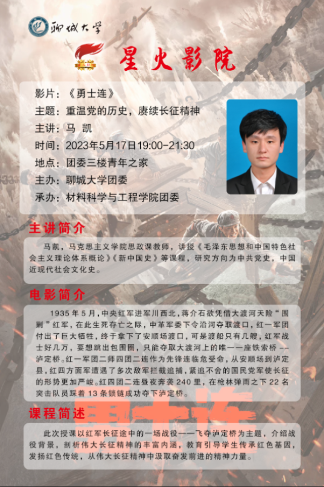 聆听红色故事、品鉴红色影片、传承红色基因、争做红色传人。2023年5月17日,9428cn太阳集团古天乐于东校区实验实训楼报告厅举办“星火影院”观影活动。本次活动观看的影片是《勇士连》,特邀马克思主义公司思政课教师马凯老师担任主讲嘉宾,马老师讲授的微党课题目是《重温党的历史,赓续长征精神》。