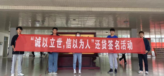 活动开始,活动人员通过宣传提醒同学们要遵守契约精神,树立诚信观念,认识到诚信还贷、珍惜个人信用记录的重要性。同时,他们还督促毕业生认真完成国家开发银行生源地助学贷款“员工在线服务系统”中的毕业确认工作,及时了解还款计划,完成生开始还款的重要步骤。活动最后,在场的贷款毕业生在横幅上留下亲笔签名,承诺按时还款。