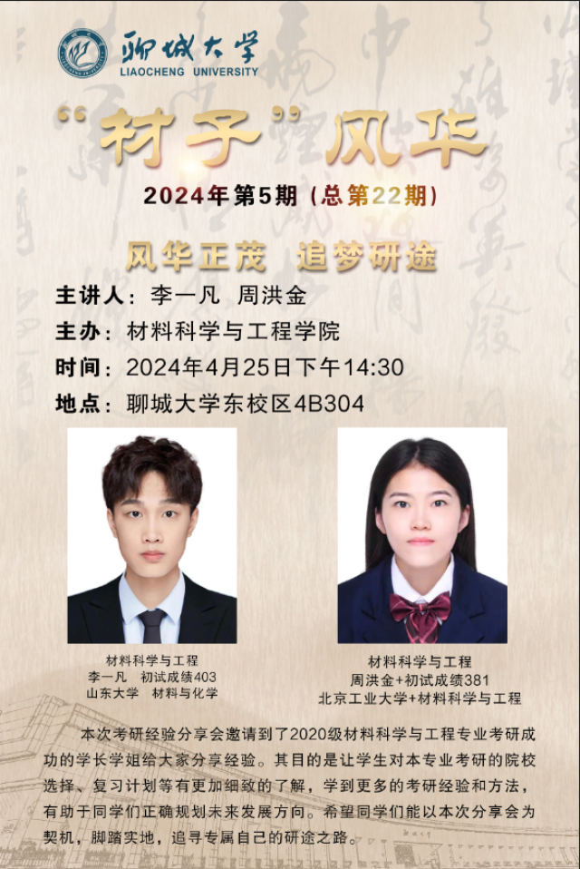 为进一步增强员工对考研的认识和了解,明确考研规划,挖掘自身潜能,营造良好的考研氛围,2024年4月25日,公司于4#B304开展材料科学与工程专业考研经验分享会,特邀2020级优秀考研员工李一凡、周洪金担任主讲。