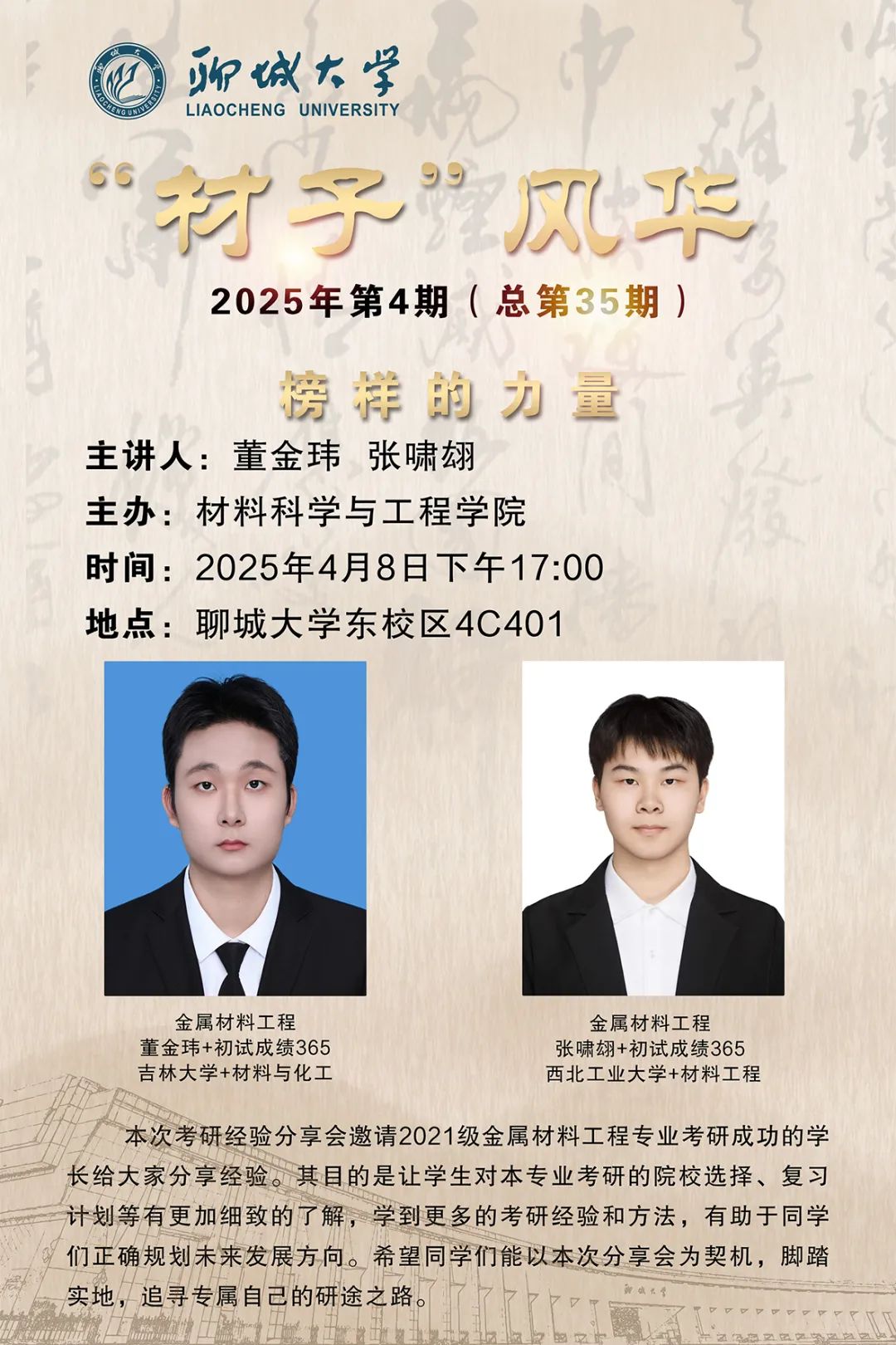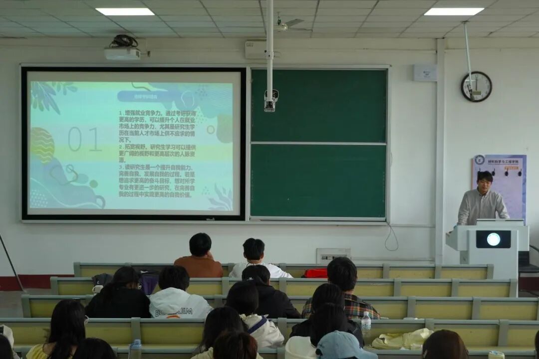 为加强公司学风建设,促进学术交流与人才培养,助力材料学子科学规划考研路径,2025年4月8日,9428cn太阳集团古天乐于东校区4#C401开展金属材料工程专业考研经验分享交流会。本次交流会特邀2021级金属材料工程专业优秀考研学子董金玮、张啸翃担任主讲嘉宾,2022级金属材料工程专业全体同学参加。