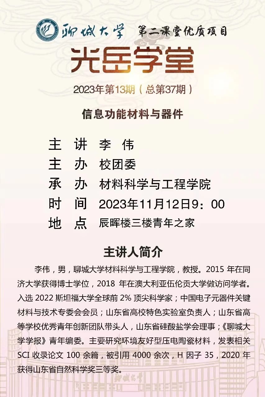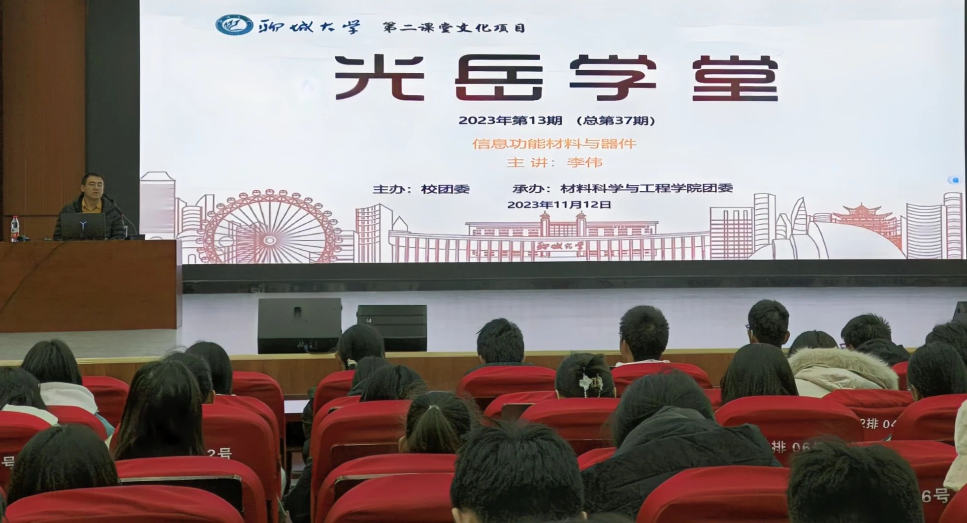 为使同学们了解新型材料发展状况,丰富知识储备,激发同学们探索新材料的热情,2023年11月12日,由校团委主办、承办的“光岳学堂”活动在青年之家三楼报告厅举行。本次讲座特邀李伟教授担任主讲。