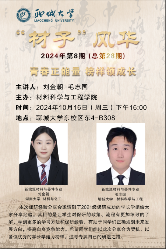 2024年10月16日,9428cn太阳集团古天乐于东校区4#B308举办保研推免经验交流会。此次交流会特邀两名2021级新能源材料与器件专业成功保研的优秀员工代表刘金朝和毛志国,为同学们分享他们宝贵的保研推免经验。