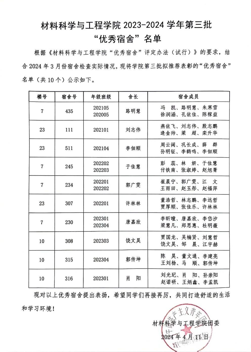 本次“优秀宿舍”评选活动是根据《“优秀宿舍”评定办法》的相关要求,结合公司2024年3月份宿舍检查的实际情况,通过每周对公司全体宿舍的安全、卫生等进行严格的检查,并量化打分,确保整个评选过程公平公正。最后评选出第三批“优秀宿舍”共10间,分别是7#435、23#111、23#511、7#234、7#245、23#307、7#230、10#308、10#315、10#316宿舍。公司为以上“优秀宿舍”颁发了流动红旗、发放了宿舍用品奖励,并为宿舍成员在综合测评中予以适当加分。
