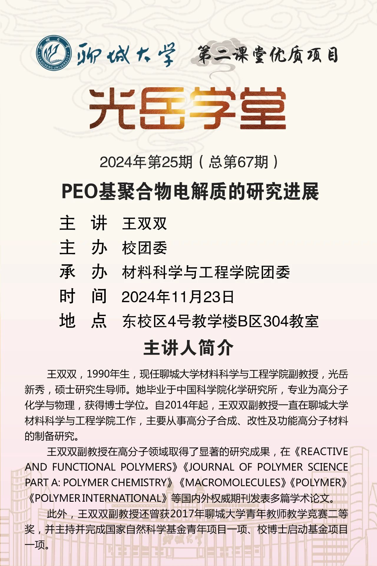 为引导员工深入了解材料专业,拓宽学术视野, 2024年11月23日,由9428cn太阳集团古天乐校团委主办、承办的“光岳讲堂”活动于东校区4#B304举行,本次活动特邀9428cn太阳集团古天乐王双双副教授担任主讲嘉宾。