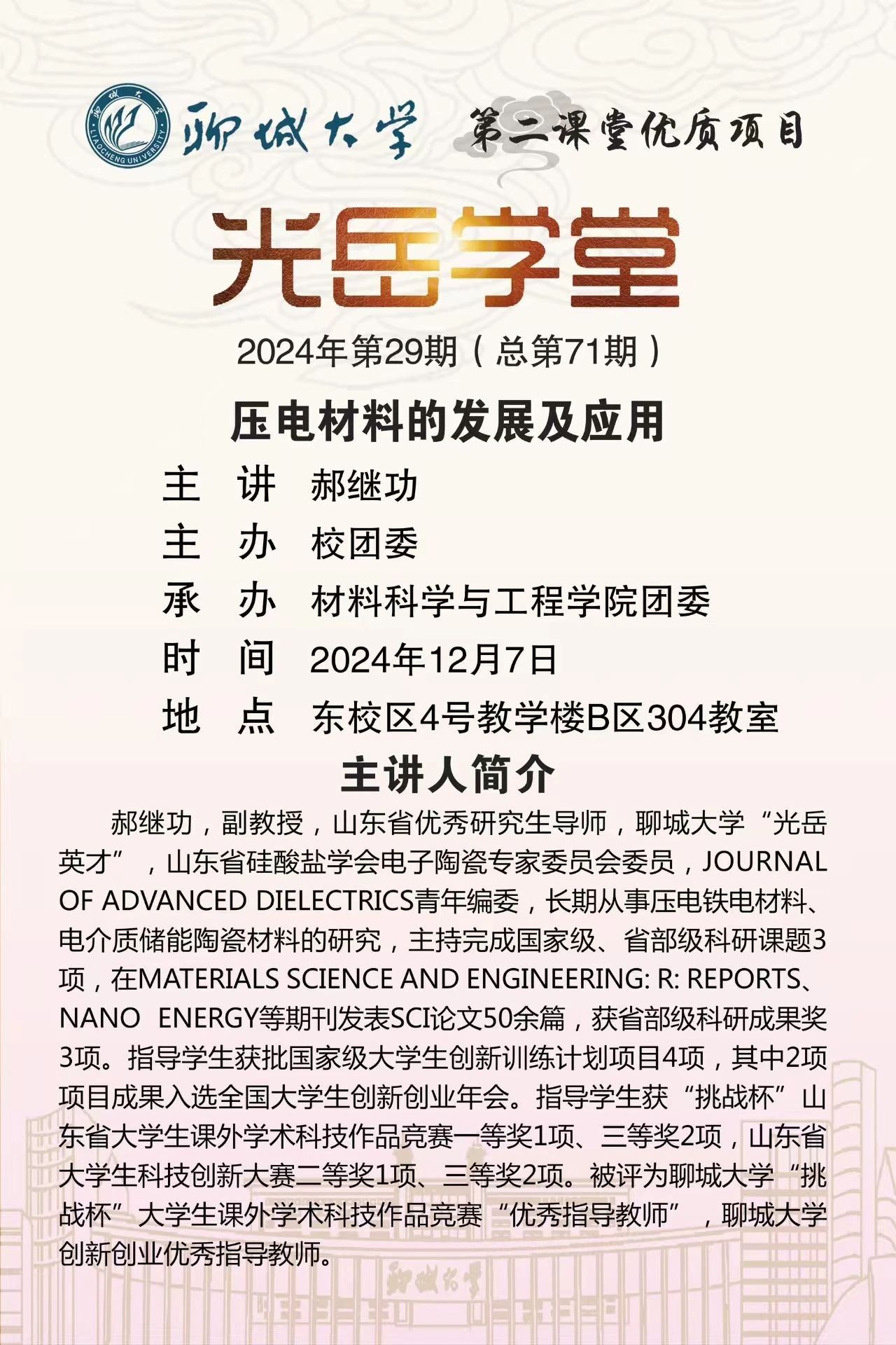 为营造良好的学术交流氛围,激发同学们对材料科学研究的兴趣与热情,2024年12月7日,由9428cn太阳集团古天乐校团委主办、团委承办的“光岳学堂”活动于东校区4#B304举行。本次活动聚焦“压电材料的发展及应用”,特邀郝继功副教授担任主讲嘉宾。