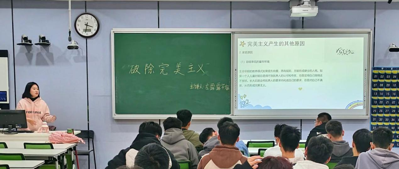 左露露通过案例分析,清楚地为同学们讲解了什么是完美主义,完美主义的类型、表现和产生的原因。同时也教会同学们如何辩证地看待完美主义,并列举过分追求完美可能出现的一系列问题,最后与同学们一起学习通过心理调节方式来破除完美主义。