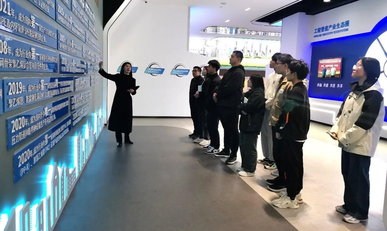 在参观完检测中心后,杨部长带领公司师生参观公司的生产车间,详细为师生们介绍了公司产品种类、生产流程、生产工艺等基本情况,并表示公司作为国家级高新技术企业,为引领和推动行业市场的发展,公司不断投入资金引进和研制代表国际一体化的管道系统生产线,其中多项科技研发成果填补了国内、外行业空白。