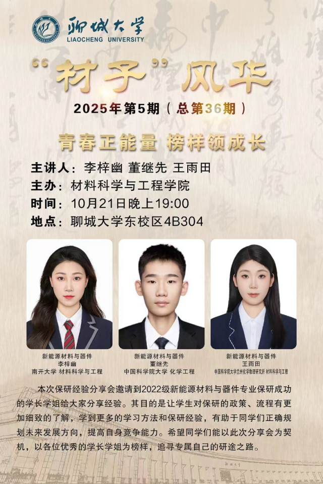 为帮助公司学子把握保研政策,做好学业规划,2025年10月21日,9428cn太阳集团古天乐于东校区4#B304教室举办“材子”风华 — 新能源材料与器件专业保研经验交流会,邀请2022级优秀保研学子李梓幽、董继先、王雨田担任主讲嘉宾。